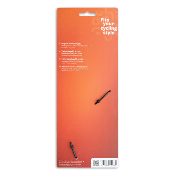 Deze compacte fietsspiegel voor montage aan de rechterzijde van het stuur biedt optimale zichtbaarheid en veiligheid in het verkeer. Het spiegeloppervlak van 110 x 47 mm geeft een helder beeld van achteropkomend verkeer en is volledig verstelbaar voor de juiste kijkhoek. De spiegel wordt stevig bevestigd rond de stuurbuis (Ø 18 – 24 mm) met een robuuste klemconstructie. Geschikt voor diverse stadsfietsen, e-bikes en speed pedelecs. Verpakt op kaart met barcode.