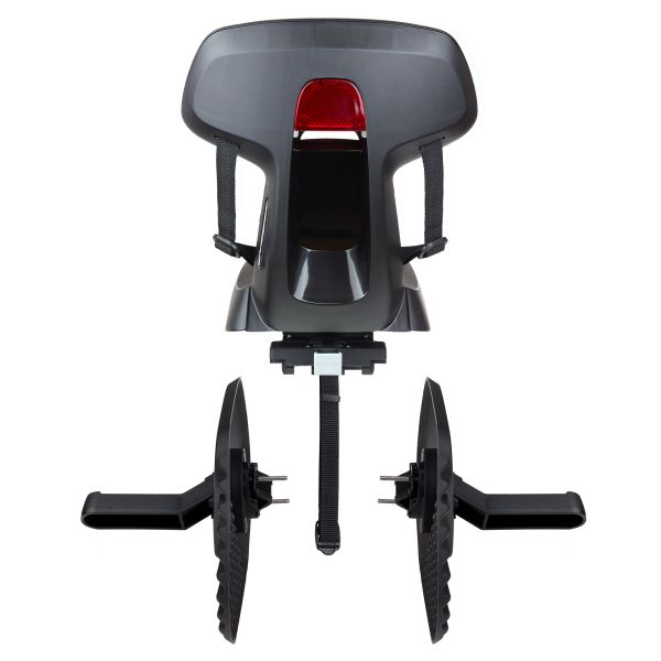 - Veiligheid voorop: wordt geleverd met spaakbescherming voor de beugel, verstelbare voetsteunen en beschermplaten bij de voetsteunen. Inclusief een achterreflector en een extra band voor veilige bevestiging aan het fietsframe.