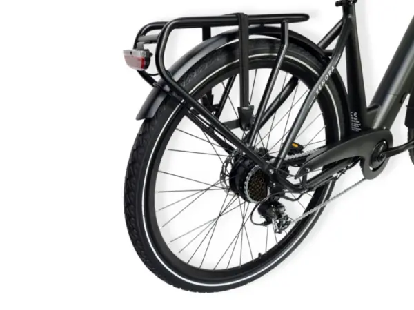 De Tracy valt direct op door zijn strakke mat zwarte frame met een geïntegreerde 468 Wh accu, die eenvoudig uitneembaar is om los op te laden. De betrouwbare motor in het achterwiel zorgt voor soepele ondersteuning bij elke rit.