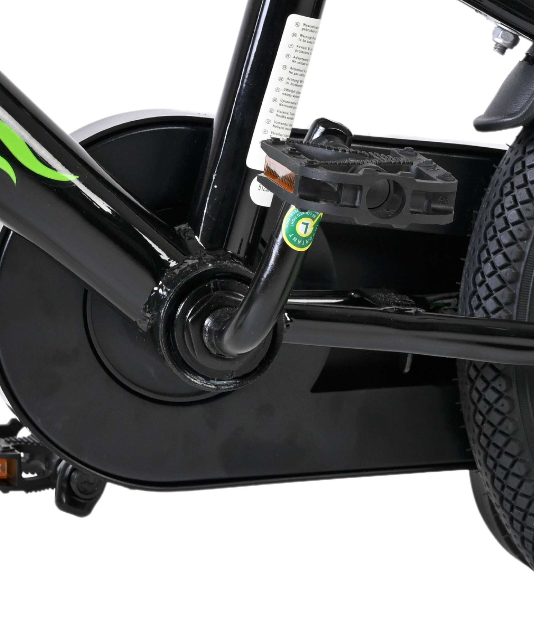 De fiets is uitgerust met een terugtraprem en een handrem, zodat er altijd veilig en gecontroleerd geremd kan worden. De gesloten kettingkast beschermt kleine vingertjes en houdt de ketting schoon. Dankzij de reflectoren in de wielen, voor en achter, is je kind goed zichtbaar onderweg.
